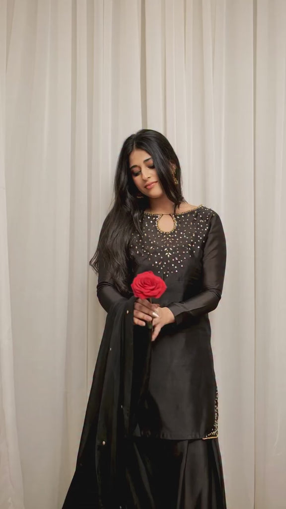 A timeless black ensemble crafted in luxurious s silk, Siyara embodies understated glamour. The shirt features full sleeves and a classic Hyderabadi gala adorned with delicate embellishments along the neckline. The round daman is enhanced with subtle detailing, while an asymmetrical accent on the left hem edge adds a contemporary touch. Paired with a organza dupatta, this outfit exudes refined elegance — perfect for evening festivities and formal gatherings.