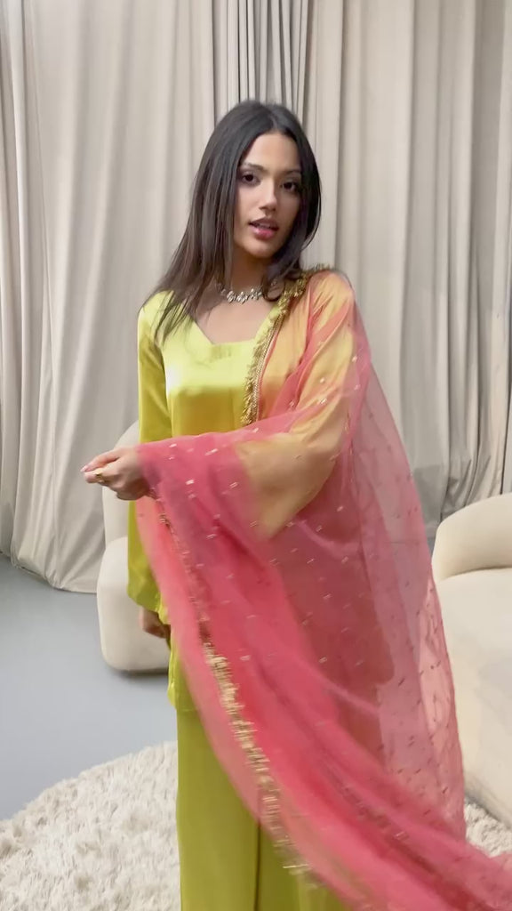Crafted in luxurious Shamooz silk, this vibrant ensemble features a Green silk kurti layered with a sheer Mukesh dupatta with gold detailing, Paired with flared trousers. Light, fluid, and refined, this 3-piece set is perfect for festive gatherings.
